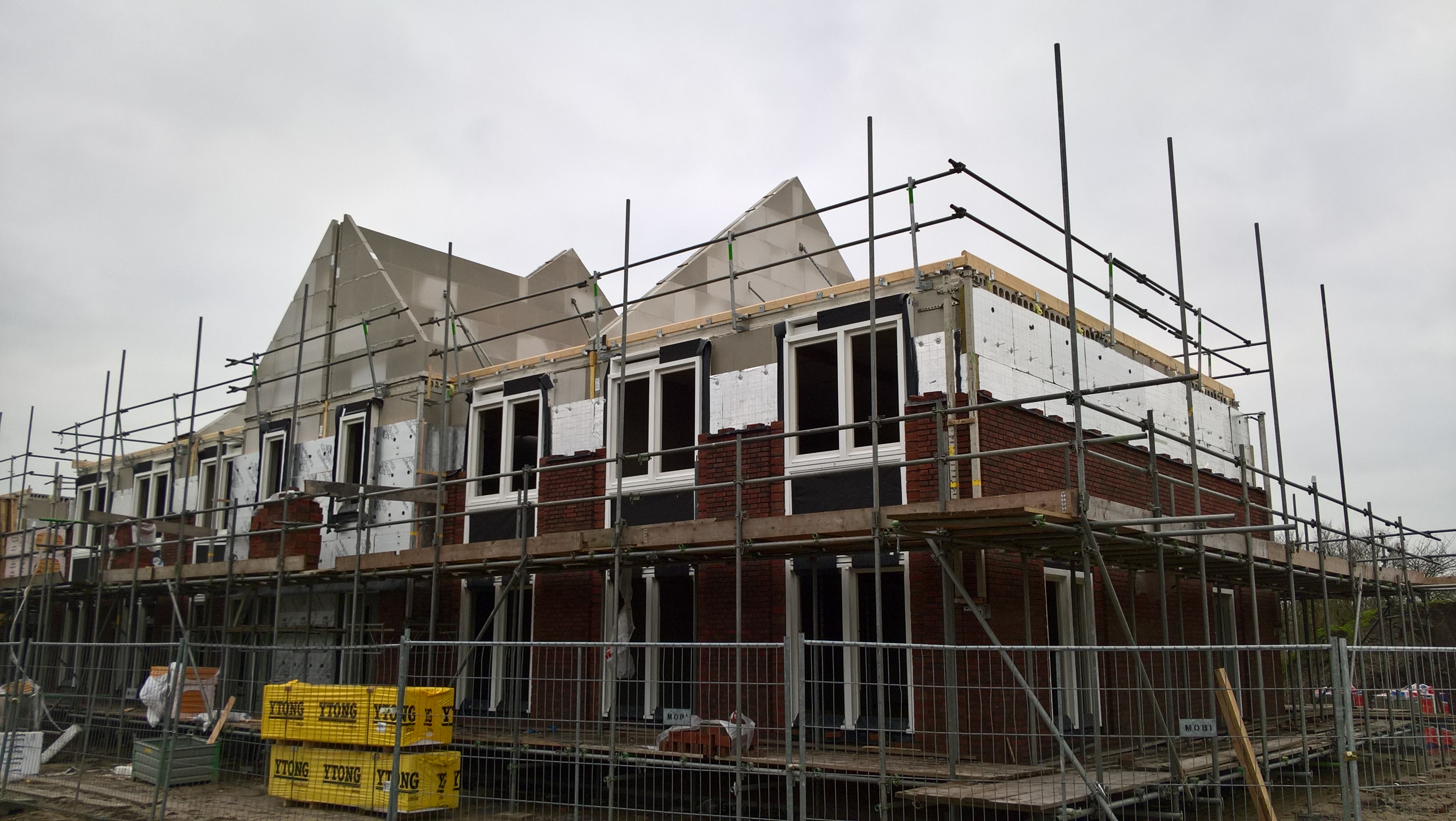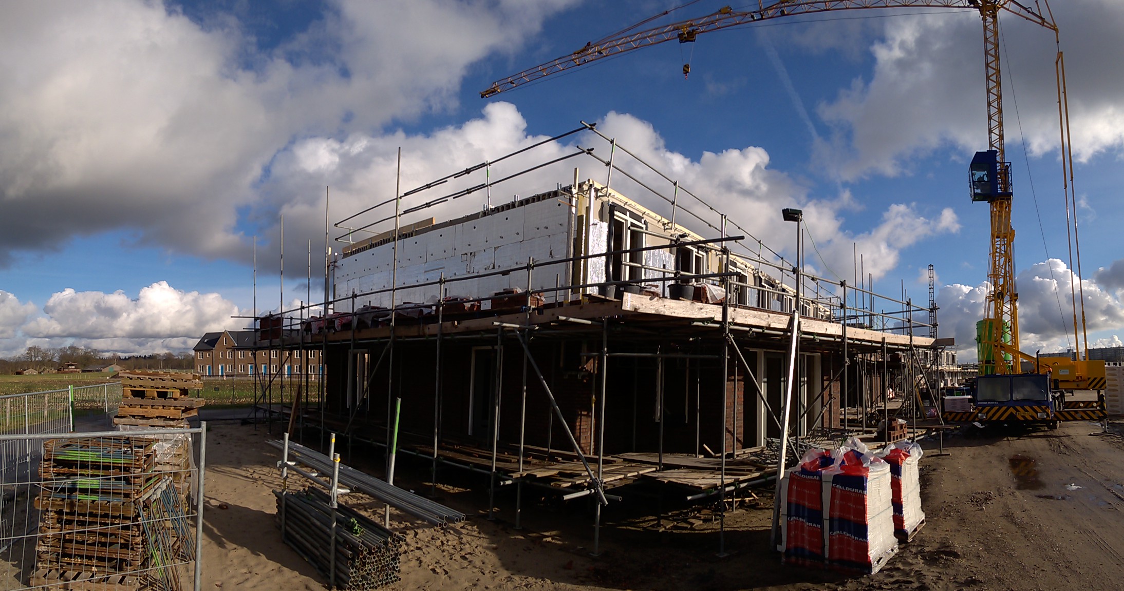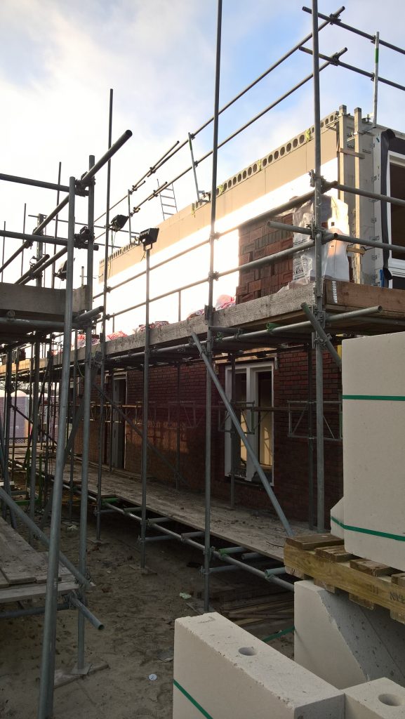 Er is wat isolatiemateriaal aangebracht en de buitenmuur komt bijna rondom boven de steiger uit. De blokken met schuine kanten voor de zolder staan al klaar.